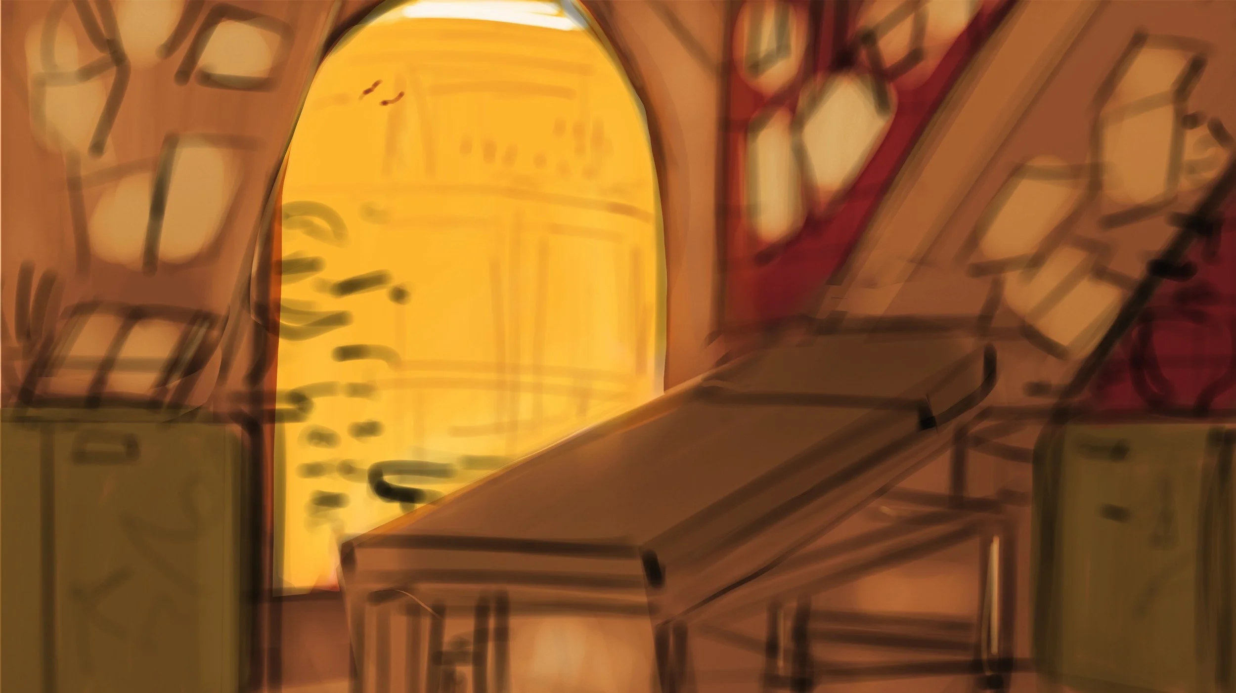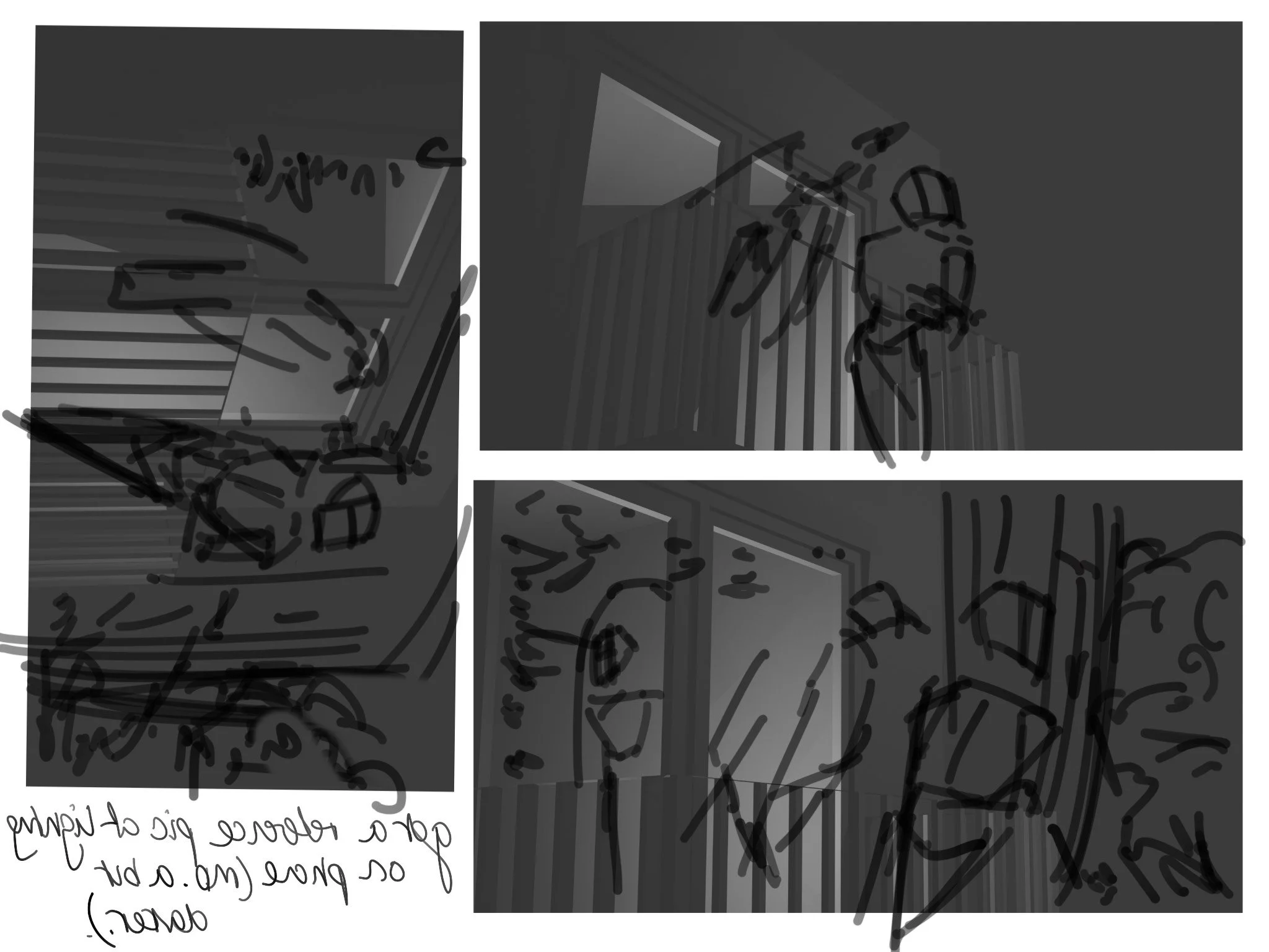 The composition development. I couldn't choose which angle to use to best capture the scene, so I made a few thumbnail sketches before settling on the bottom right.